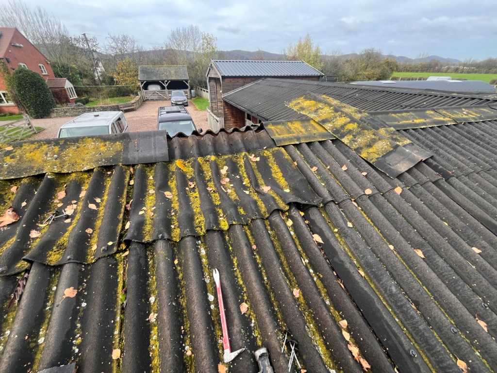 Replacing the 30 year old ridge cap and several upper panels of Onduline roofing. Setting the new panels with more overlap than previous one to reduce chance of failure.