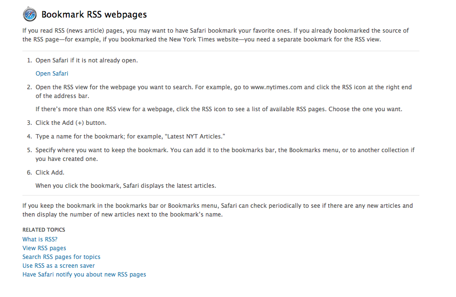i) Safari has a built in RSS reader – this can be configured so you can read your feeds in Safari or even in Apple Mail. Check you safari help menu for more details. (example)